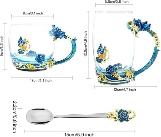 1 Set Coffee Cup Tea Mug with Spoon Set Handmade Enamel Butterfly Flower for Women Man,Father's Day, Mother's Day, Valentine's Day gifts (2 Pack)