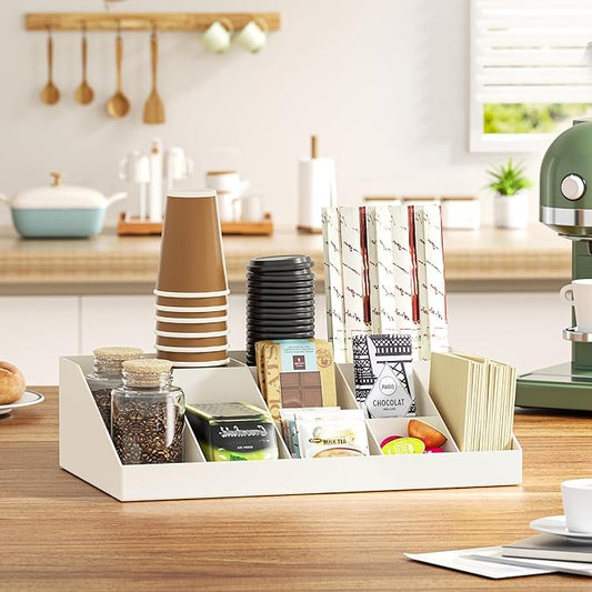SZQINJI Coffee Condiment Organizer Station - 10-Compartment Break Room Coffee Station Caddy Cup Storage Bar Holder - White